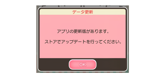アプリ起動時、下記バージョンアップのお知らせが表示されますので、OKボタンを押していただき、「App Store」「Google Play」にて、アップデートをお願いいたします。
