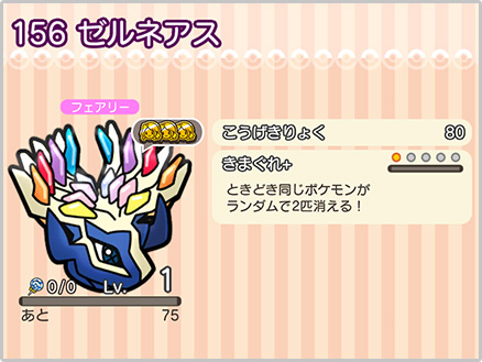 パズルエリアにいる、自分と同じポケモン(ゼルネアス)を、ランダムで2匹消すことができる。